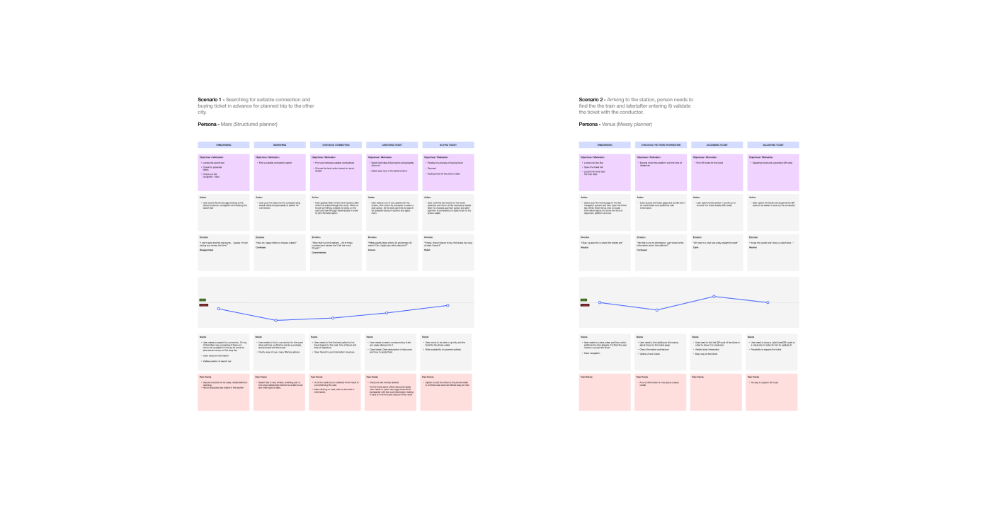 To get better understanding of core passenger profiles, I created few user personas based on research I did at the beginning of the project. This lead me to come across interesting pattern that helped me to highlight 2 prominent type of personas relating to how people plan their journeys.