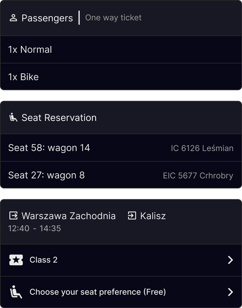 PKP app (and train booking app in general) is very complex, featuring many design elements that are tailored specifically to the use context of given provider. In this project I focused on ticket flow and optimising purchasing process, while also making sure my solutions will be tailored to the use & business requirements of the company. On top of that it was very crucial for project success to thoroughly research user behaviour and patterns regarding traveling with trains in Poland.