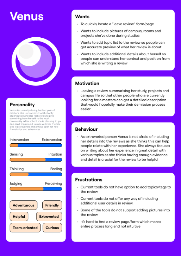 I do think that this project really tested my research skills, as I needed to cooperate and set up multiple meetings with various people from university related background, which resulted in gathering wide range if information. This really pushed me to be more strict and focused with my data analysis in order to ensure that I could retrieve most valuable information from the data. All of this turned crucial in developing potential solutions and transferring them to the design. For next time I would 100% spend more time analysing all the data, as this time project deadline forced me to be agile with my analysis.